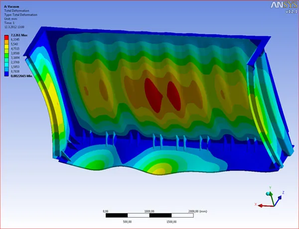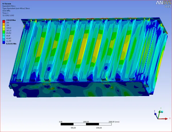 KOLEKTOR ETRA is using ANSYS software for structural analyses of all critically loaded mechanical parts, like transformer housing, magnetic core support structure, etc. For example, the critical load cases of transformer housing are: